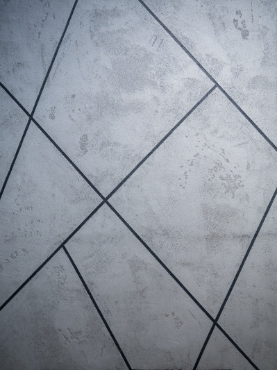 Betónový vzhľad doplnený o abstraktné pruhy podfarbené perleťovým reliéfom za účelom prepojenia ostatných efektov v interéri a zladenie s prepletaným zábradlým galérie.